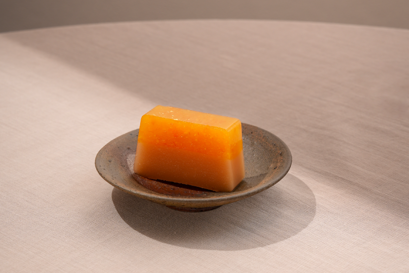 旬のみかんの果肉と果汁をたっぷり使った、季節の羊羹。